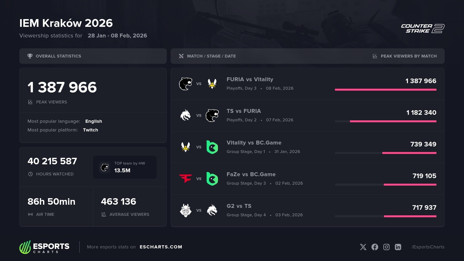 不仅Vitality创下了防备记录,IEM克拉科夫站自己也刷新了历史——成为CS史上线上不雅众鸿沟最大的非Major赛事。