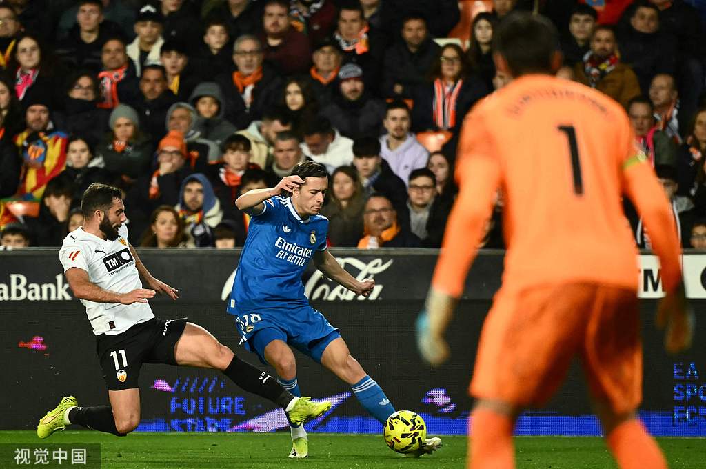 北京时辰2月9日凌晨,西甲第23轮比赛,皇马客场对阵瓦伦西亚。上半场比赛,姆巴佩小角度抽射被扑,希门尼斯插上射门被挡,半场两队互交白卷;易边再战,巴尔韦德远射被扑,卡雷拉斯凭借个东说念主智商推射破僵,贝尔特兰铲掷中柱,姆巴佩补时破门杀死比赛。最终,皇马客场2-0打败瓦伦西亚。